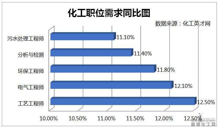 从需求的职位分类来看,化工英才网的招聘数据显示,工艺工程师、电气工程师、环保工程师、分析与检测、污水处理工程师的职位招聘需求与去年同期相比上涨幅度明显,同比涨幅分别为12.5%、12.1%、11.8%、11.4%、11.1%。